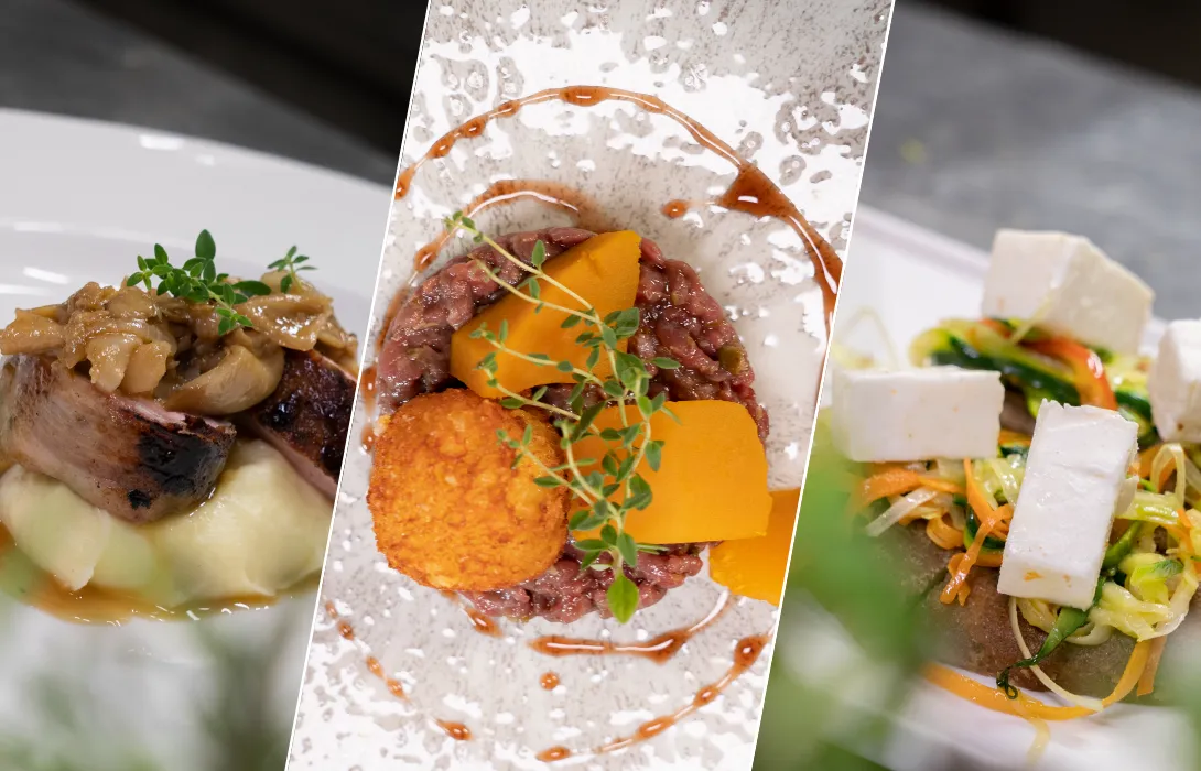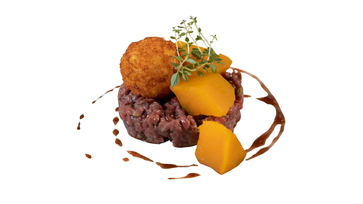 Un antipasto che unisce eleganza e territorio: tartare di cervo delle Orobie con riduzione al Moscato di Scanzo, impreziosita da una sfera croccante di Branzi e dolci note di zucca in mostarda.
