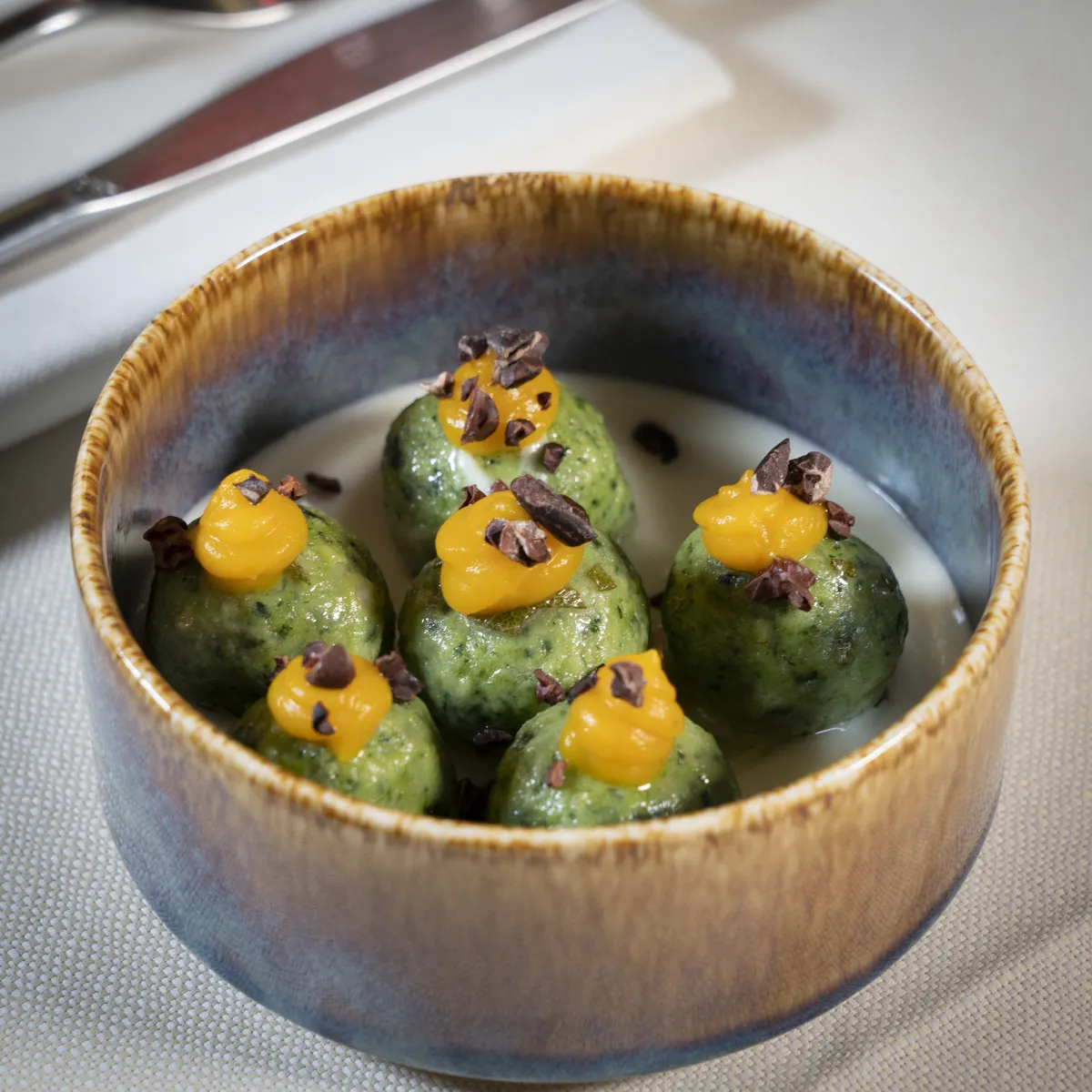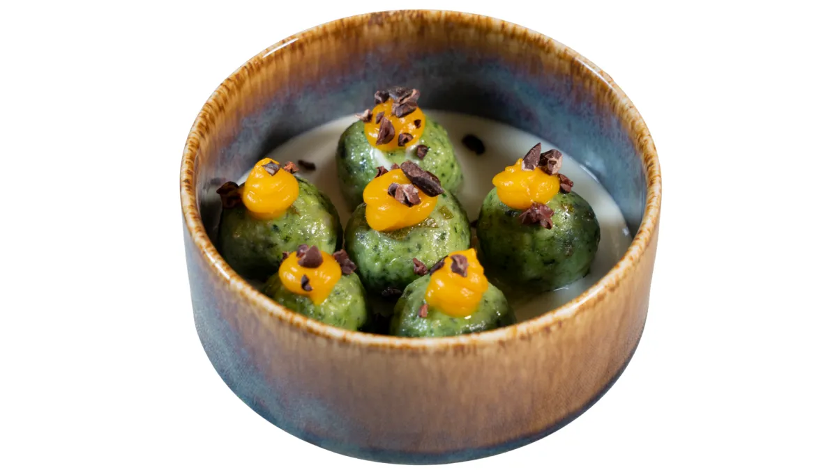 Canederli al cavolo nero serviti su fonduta cremosa di Strachitund, completati da mousse di zucca e gruè di cacao.