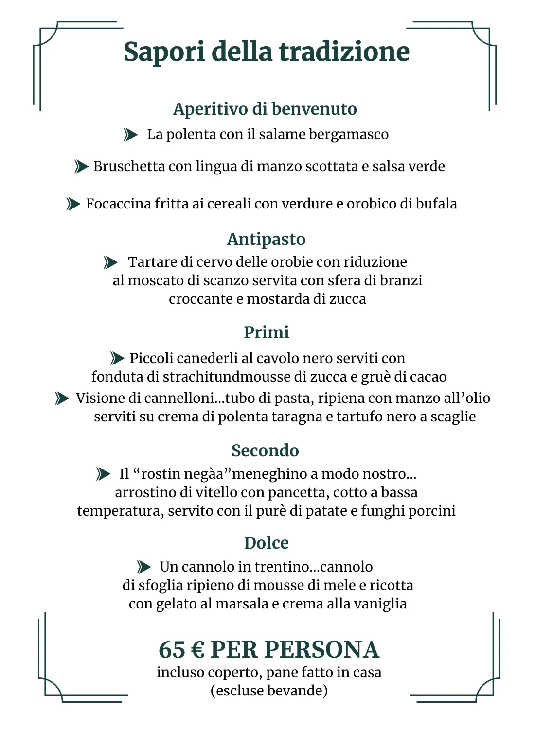 Un menù esclusivo creato dallo Chef per esaltare al meglio i sapori del territorio, tutto a 65€ a persona (min. 2 perosne).