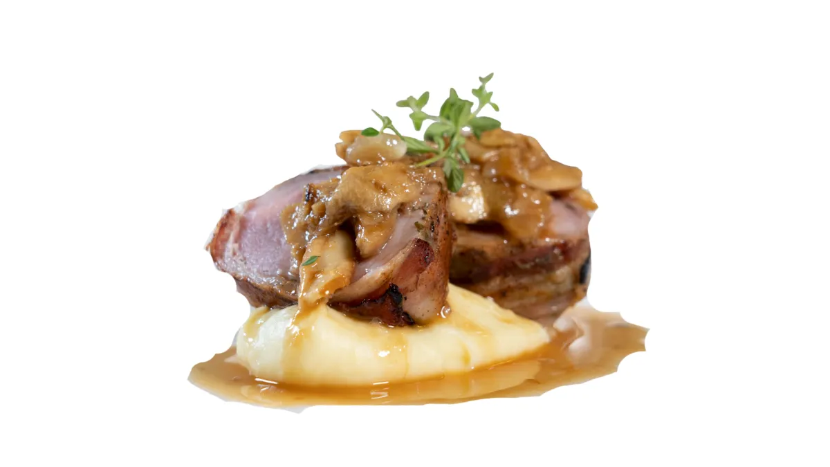 Il classico milanese, rivisitato con cura: arrostino di vitello avvolto in pancetta, cotto a bassa temperatura e servito su purè vellutato di patate, con porcini trifolati che ne esaltano i profumi d’autunno.